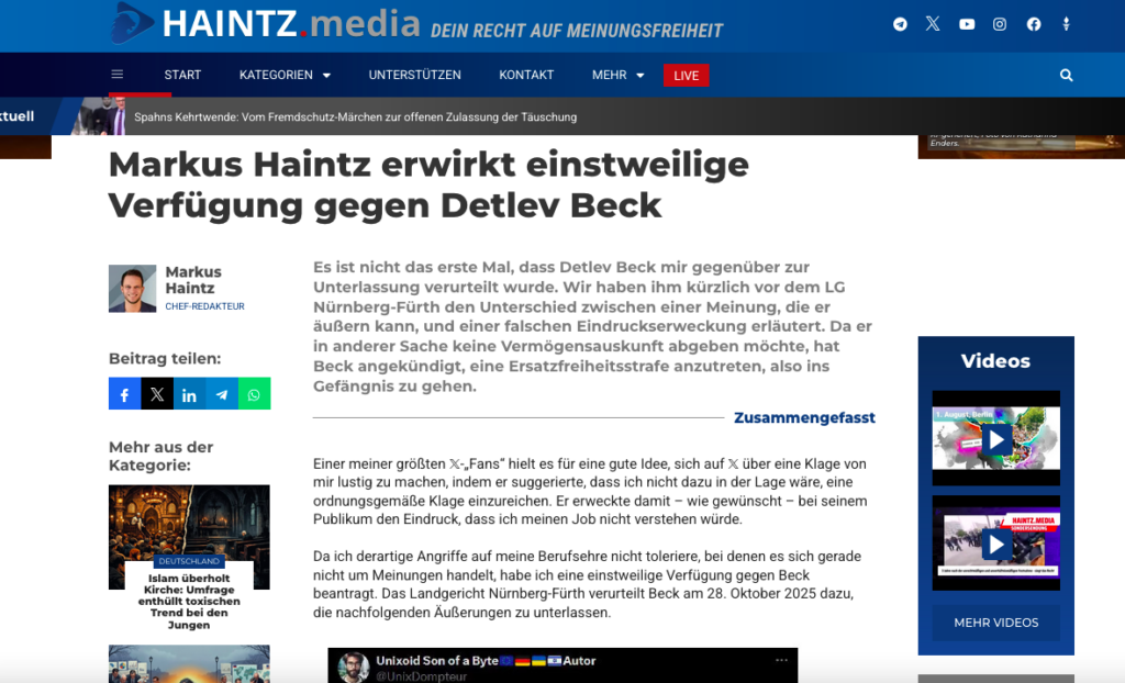 In der Begründung fand die Kammer dabei ungewöhnlich deutliche Worte. Haintz verbreite seit Jahren nahezu täglich ketzerische Beiträge, perfide Falschinformationen und Verschwörungsmythen zu Themen wie Corona, Klimawandel, Judentum oder dem Ukrainekrieg und provoziere damit gezielt Reaktionen in sozialen Medien. Wer derart offensiv austeile, so die Richter, müsse in der Regel auch entschädigungslos einstecken. Das Oberlandesgericht Stuttgart bestätigte diese Linie später weitgehend und ging sogar noch einen Schritt weiter: Auch die nahezu anlasslose Bezeichnung als „Vollidiot“ sei zulässig. Eine weitere Überprüfung durch den Bundesgerichtshof ist dort noch anhängig.