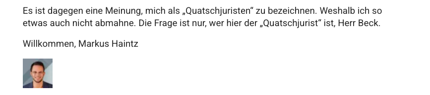»Quatschjurist« wurde auf Unterlassung im 1. Verfahren in Ellwangen genannt. Im 2. Verfahren in Hamburg wurde »Quatschjurist« einfach weggelassen, weil Haintz ein »Quatschjurist« ist. Anwalt Jun hat schon festgestellt, dass Haintz »Quatschjura« betreibt.